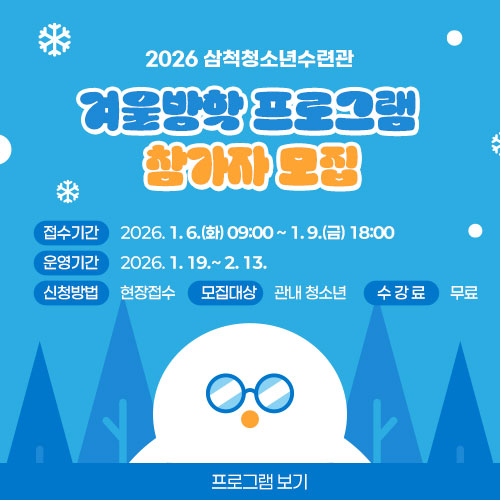 삼척 청소년이 함께 꿈꾸는 행복의 터전! 청소년교육문화 프로그램 청소년방학 프로그램 청소년자원봉사 청소년일터체험 청소년동아리 view more 행사일정 2026. 01 Sun Mon Tue Wed Thu Fri Sat 1 2 3 4 5 6 7 8 9 10 11 12 13 14 15 16 17 18 19 20 21 22 23 24 25 26 27 28 29 30 31 알림판 청소년 수련관모집 공고 자세히보기 공지/공고 행사교육 보도자료 2025 청소년어울림마당 에너지 UP 청소년축제 행사안내! 2025-09-25 2025 청소년 해외역사문화탐방 선발안내 2025-09-22 2025년 삼척청소년수련관 하반기 교육문화프로그램 모집 안내 2025-08-01 [결과발표: 기준 7.21.(월) 09:10] 2025 청소년수련관 여름방학 프로그램 참가자 명단 2025-07-18 [결과발표] 신세계 이엔씨와 함께 하는 리테일테크 코딩교실 2025-07-04 2025년 삼척시 원어민 화상영어 지원사업 안내문 2025-06-30 2025 청소년수련관 여름방학 프로그램 참가자 모집 2025-06-20 [변경] 신세계 I&C와 함께하는 리테일테크 코딩교실 참가자 모집 2025-06-13 2025 청소년어울림마당 함께, 그린(green) 행사 안내! 2025-05-21 *청소년운영위원회 기획프로그램 운영 안내* 2025-05-15 2026 겨울방학 프로그램 참가자 모집안내 2025-12-26 코로나19 삼척사랑백신 프로그램 2020-04-01 평창평화포럼 2020-02-13 2020 겨울방학프로그램 운영 2020-01-13 2019 겨울방학프로그램 운영 2018-11-29 수능이후 프로그램 운영 2018-11-13 2018년 삼척시 청소년어울림마당 폐막식 2018-11-13 * 제18회 죽서그림.휘호대회 2018-05-12 *2018 삼척시 청소년 대학탐방활동 운영 2018-03-28 2018 삼척시청소년수련관 참여위원회 스피치 교육 2018-03-28 ‘청소년 건강 먹거리 개발’프로그램 운영 2024-08-02 제17회 삼척시 청소년 봉사상 후보자 모집 2023-03-07 최우수운영기관 선정 2022-01-20 해변안전활동 2020-08-28 강원도지사상 수상 동아리LUXE 2020-07-30 PBL프로젝트 공모사업 선정 2020-06-25 공모사업 선정 2020-05-25 삼척사랑백신 2020-04-01 삼척사랑백신활동 2020-04-01 해양환경공단과의 업무협약 2020-03-30 Click 포토갤러리 2025 청소년어울림마당 에너지UP! 청소년축제 행사사진 2025 청소년어울림마당 함께, 그린(green) 행사 사진 *청소년운영위원회 기획프로그램* *청소년 해외역사문화탐방(대만)* *청소년운영위원회 한가람 16기* 2024 주말체험프로그램 『크리스마스요리사』 준비중입니다.