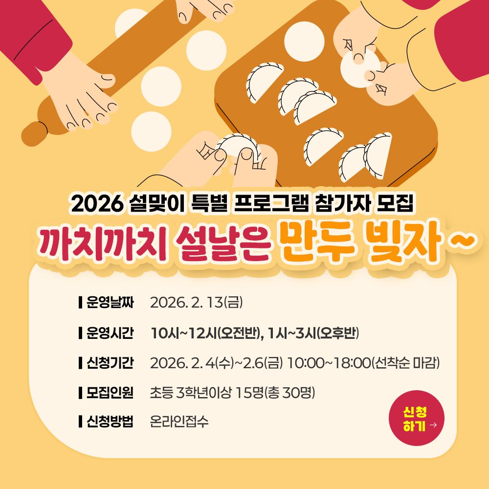 삼척 청소년이 함께 꿈꾸는 행복의 터전! 청소년교육문화 프로그램 청소년방학 프로그램 청소년자원봉사 청소년일터체험 청소년동아리 view more 행사일정 2026. 01 Sun Mon Tue Wed Thu Fri Sat 1 2 3 4 5 6 7 8 9 10 11 12 13 14 15 16 17 18 19 20 21 22 23 24 25 26 27 28 29 30 31 알림판 청소년 수련관모집 공고 자세히보기 자세히보기 자세히보기 자세히보기 공지/공고 행사교육 보도자료 2026 설맞이 특별 프로그램 참가자 모집 2026-01-22 2026년 청소년참여위원회 위원모집 2026-01-10 2026 삼척시청소년수련관 운영위원회 모집 안내 2026-01-07 2026년 삼척시청소년수련관 청소년 동아리 모집 2026-01-06 2025 청소년어울림마당 에너지 UP 청소년축제 행사안내! 2025-09-25 2025 청소년 해외역사문화탐방 선발안내 2025-09-22 2025년 삼척청소년수련관 하반기 교육문화프로그램 모집 안내 2025-08-01 [결과발표: 기준 7.21.(월) 09:10] 2025 청소년수련관 여름방학 프로그램 참가자 명단 2025-07-18 [결과발표] 신세계 이엔씨와 함께 하는 리테일테크 코딩교실 2025-07-04 2025년 삼척시 원어민 화상영어 지원사업 안내문 2025-06-30 2026 겨울방학 프로그램 참가자 모집안내 2025-12-26 코로나19 삼척사랑백신 프로그램 2020-04-01 평창평화포럼 2020-02-13 2020 겨울방학프로그램 운영 2020-01-13 2019 겨울방학프로그램 운영 2018-11-29 수능이후 프로그램 운영 2018-11-13 2018년 삼척시 청소년어울림마당 폐막식 2018-11-13 * 제18회 죽서그림.휘호대회 2018-05-12 *2018 삼척시 청소년 대학탐방활동 운영 2018-03-28 2018 삼척시청소년수련관 참여위원회 스피치 교육 2018-03-28 ‘청소년 건강 먹거리 개발’프로그램 운영 2024-08-02 제17회 삼척시 청소년 봉사상 후보자 모집 2023-03-07 최우수운영기관 선정 2022-01-20 해변안전활동 2020-08-28 강원도지사상 수상 동아리LUXE 2020-07-30 PBL프로젝트 공모사업 선정 2020-06-25 공모사업 선정 2020-05-25 삼척사랑백신 2020-04-01 삼척사랑백신활동 2020-04-01 해양환경공단과의 업무협약 2020-03-30 Click 포토갤러리 2025 청소년어울림마당 에너지UP! 청소년축제 행사사진 2025 청소년어울림마당 함께, 그린(green) 행사 사진 *청소년운영위원회 기획프로그램* *청소년 해외역사문화탐방(대만)* *청소년운영위원회 한가람 16기* 2024 주말체험프로그램 『크리스마스요리사』 준비중입니다.