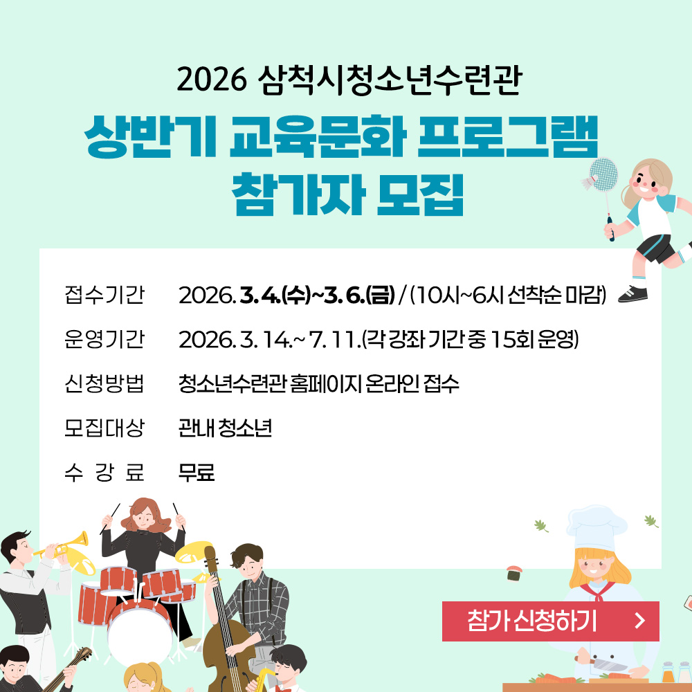 삼척 청소년이 함께 꿈꾸는 행복의 터전! 청소년교육문화 프로그램 청소년방학 프로그램 청소년자원봉사 청소년일터체험 청소년동아리 view more 행사일정 2026. 02 Sun Mon Tue Wed Thu Fri Sat 1 2 3 4 5 6 7 8 9 10 11 12 13 14 15 16 17 18 19 20 21 22 23 24 25 26 27 28 알림판 청소년 수련관모집 공고 자세히보기 공지/공고 행사교육 보도자료 2026 삼척시청소년수련관 상반기 교육문화 프로그램 참가자 모집 2026-02-13 2026년 삼척청소년오케스트라 단원모집 2026-02-10 2026 청소년수련관 3.1절 특별 프로그램 참가자 모집 2026-02-04 2026 설맞이 특별 프로그램 참가자 모집 2026-01-22 2026년 청소년참여위원회 위원모집 2026-01-10 2026 삼척시청소년수련관 운영위원회 모집 안내 2026-01-07 2026년 삼척시청소년수련관 청소년 동아리 모집 2026-01-06 2025 청소년어울림마당 에너지 UP 청소년축제 행사안내! 2025-09-25 2025 청소년 해외역사문화탐방 선발안내 2025-09-22 2025년 삼척청소년수련관 하반기 교육문화프로그램 모집 안내 2025-08-01 2026 강남구청 인터넷 수능방송(강남인강) 수강권 지원사업 안내 2026-01-28 2026 겨울방학 프로그램 참가자 모집안내 2025-12-26 코로나19 삼척사랑백신 프로그램 2020-04-01 평창평화포럼 2020-02-13 2020 겨울방학프로그램 운영 2020-01-13 2019 겨울방학프로그램 운영 2018-11-29 수능이후 프로그램 운영 2018-11-13 2018년 삼척시 청소년어울림마당 폐막식 2018-11-13 * 제18회 죽서그림.휘호대회 2018-05-12 *2018 삼척시 청소년 대학탐방활동 운영 2018-03-28 ‘청소년 건강 먹거리 개발’프로그램 운영 2024-08-02 제17회 삼척시 청소년 봉사상 후보자 모집 2023-03-07 최우수운영기관 선정 2022-01-20 해변안전활동 2020-08-28 강원도지사상 수상 동아리LUXE 2020-07-30 PBL프로젝트 공모사업 선정 2020-06-25 공모사업 선정 2020-05-25 삼척사랑백신 2020-04-01 삼척사랑백신활동 2020-04-01 해양환경공단과의 업무협약 2020-03-30 Click 포토갤러리 2025 청소년어울림마당 에너지UP! 청소년축제 행사사진 2025 청소년어울림마당 함께, 그린(green) 행사 사진 *청소년운영위원회 기획프로그램* *청소년 해외역사문화탐방(대만)* *청소년운영위원회 한가람 16기* 2024 주말체험프로그램 『크리스마스요리사』 준비중입니다.