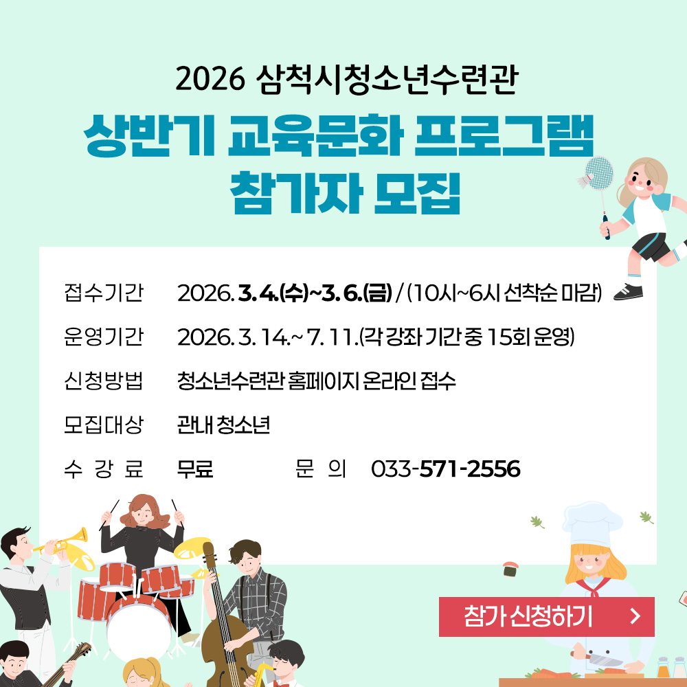 삼척 청소년이 함께 꿈꾸는 행복의 터전! 청소년교육문화 프로그램 청소년방학 프로그램 청소년자원봉사 청소년일터체험 청소년동아리 view more 행사일정 2026. 02 Sun Mon Tue Wed Thu Fri Sat 1 2 3 4 5 6 7 8 9 10 11 12 13 14 15 16 17 18 19 20 21 22 23 24 25 26 27 28 알림판 청소년 수련관모집 공고 공지/공고 행사교육 보도자료 2026 삼척시청소년수련관 상반기 교육문화 프로그램 참가자 모집 2026-02-13 2026년 삼척청소년오케스트라 단원모집 2026-02-10 2026 청소년수련관 3.1절 특별 프로그램 참가자 모집 2026-02-04 2026 설맞이 특별 프로그램 참가자 모집 2026-01-22 2026년 청소년참여위원회 위원모집 2026-01-10 2026 삼척시청소년수련관 운영위원회 모집 안내 2026-01-07 2026년 삼척시청소년수련관 청소년 동아리 모집 2026-01-06 2025 청소년어울림마당 에너지 UP 청소년축제 행사안내! 2025-09-25 2025 청소년 해외역사문화탐방 선발안내 2025-09-22 2025년 삼척청소년수련관 하반기 교육문화프로그램 모집 안내 2025-08-01 2026 강남구청 인터넷 수능방송(강남인강) 수강권 지원사업 안내 2026-01-28 2026 겨울방학 프로그램 참가자 모집안내 2025-12-26 코로나19 삼척사랑백신 프로그램 2020-04-01 평창평화포럼 2020-02-13 2020 겨울방학프로그램 운영 2020-01-13 2019 겨울방학프로그램 운영 2018-11-29 수능이후 프로그램 운영 2018-11-13 2018년 삼척시 청소년어울림마당 폐막식 2018-11-13 * 제18회 죽서그림.휘호대회 2018-05-12 *2018 삼척시 청소년 대학탐방활동 운영 2018-03-28 2026 청소년수련관 설맞이 특별 프로그램 운영 2026-01-26 ‘청소년 건강 먹거리 개발’프로그램 운영 2024-08-02 제17회 삼척시 청소년 봉사상 후보자 모집 2023-03-07 최우수운영기관 선정 2022-01-20 해변안전활동 2020-08-28 강원도지사상 수상 동아리LUXE 2020-07-30 PBL프로젝트 공모사업 선정 2020-06-25 공모사업 선정 2020-05-25 삼척사랑백신 2020-04-01 삼척사랑백신활동 2020-04-01 Click 포토갤러리 2025 청소년어울림마당 에너지UP! 청소년축제 행사사진 2025 청소년어울림마당 함께, 그린(green) 행사 사진 *청소년운영위원회 기획프로그램* *청소년 해외역사문화탐방(대만)* *청소년운영위원회 한가람 16기* 2024 주말체험프로그램 『크리스마스요리사』 준비중입니다.
